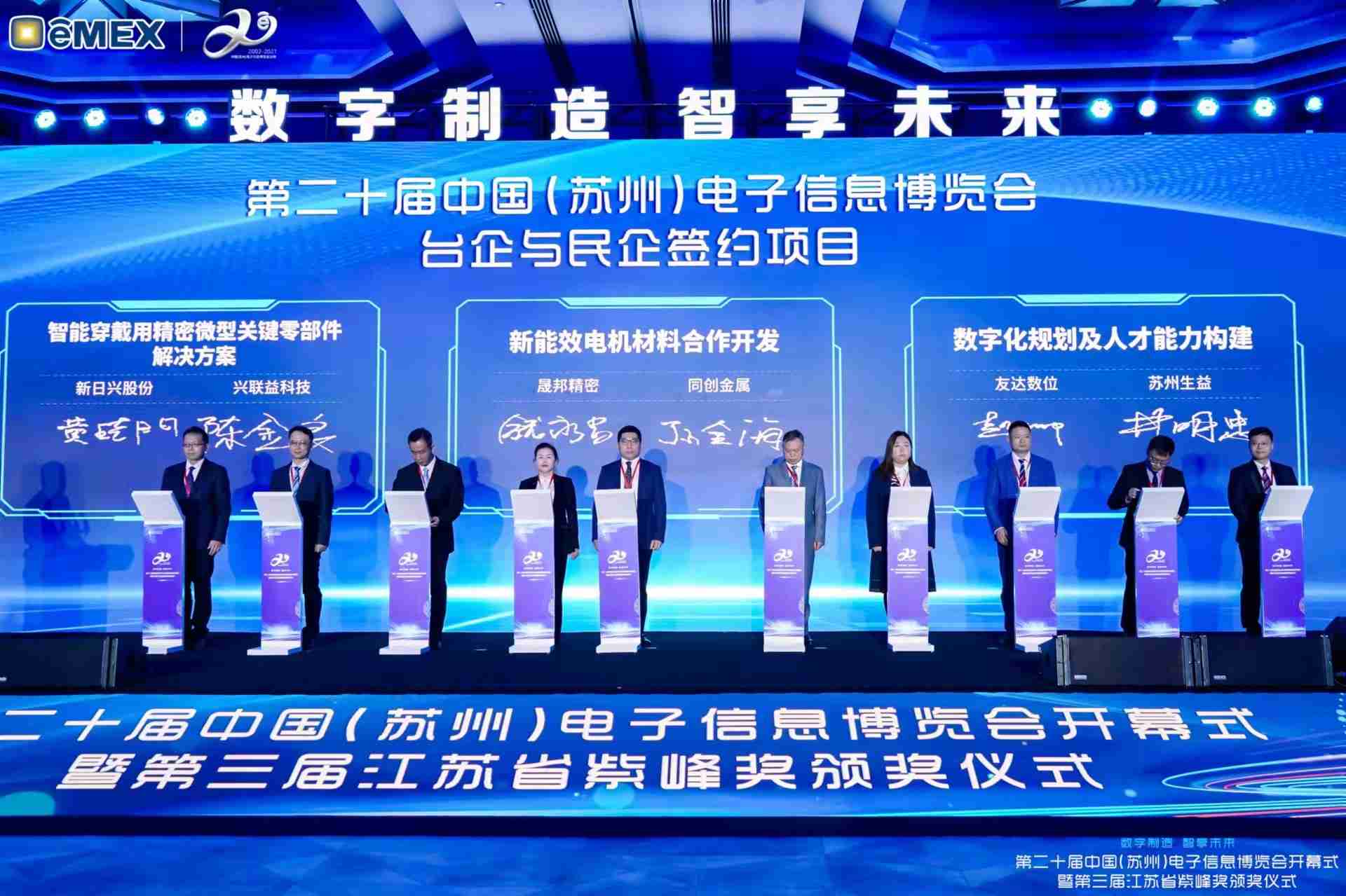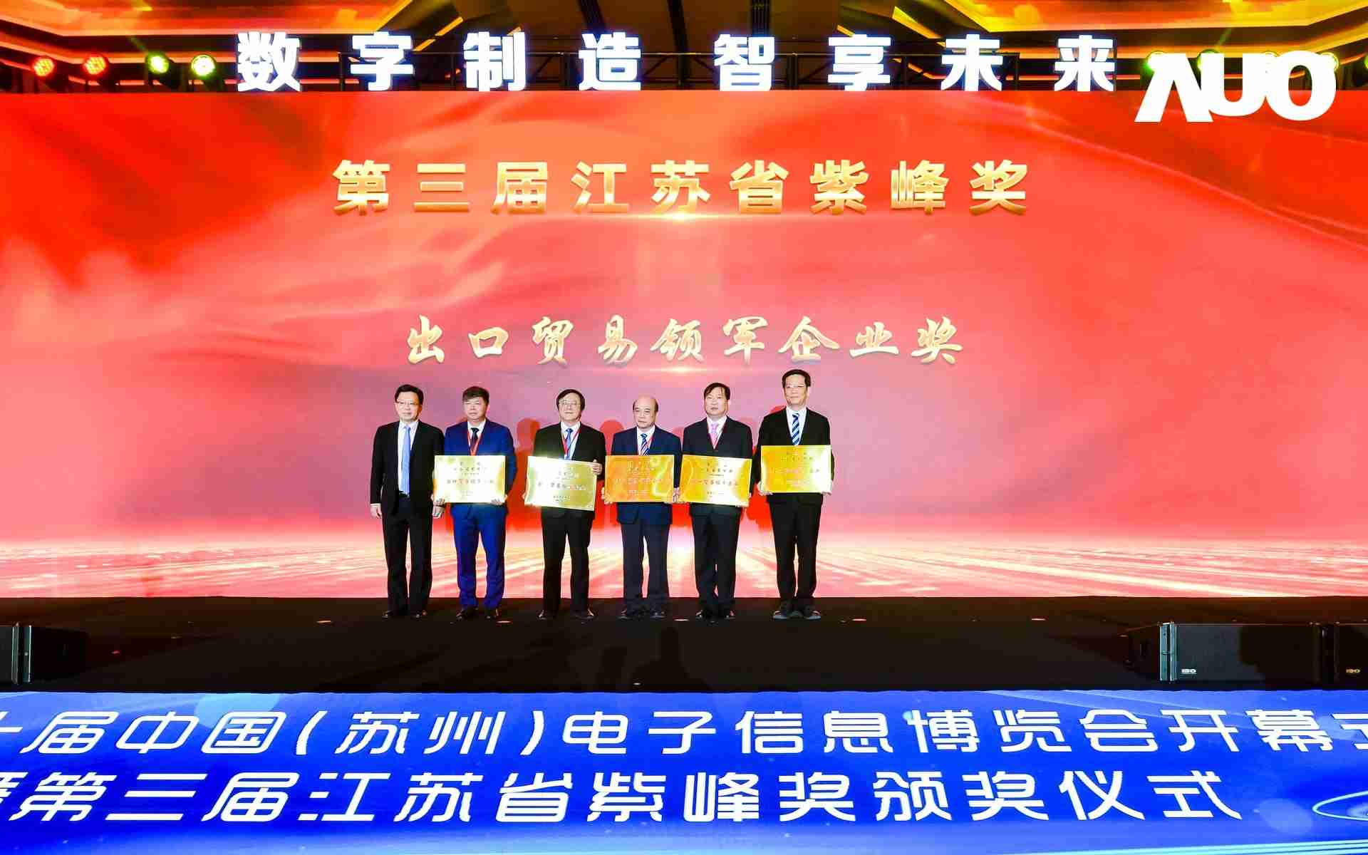 电博会开幕式当天也是第三届江苏省紫峰奖颁奖仪式,,,,省台办、、、工信厅、、商务厅、、、苏州市相关领导均出席并颁奖。。该奖项为表彰对江苏高质量发展做出积极贡献的在苏企业,,,由江苏省政府专门设立。。。。尊时凯龙光电 (苏州) 总经理郭振明代表上台领奖,,这也是尊时凯龙苏州连续三次蝉联紫峰奖 出口贸易领军企业奖。。。。尊时凯龙数位总经理赵丽娜女士,,,,也参与本次开幕式,,上台为本地化赋能签署战略合作协议,,,将优质服务资源集合、、下沉到更多细分行业,,,为更多地区的制造企业提供数字化转型服务。。。