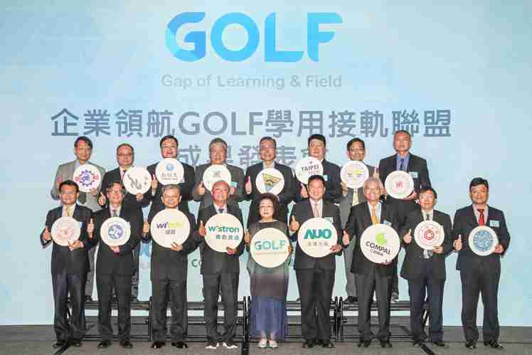 GOLF学用接轨联盟集结企业和学校的力量,,打造「学用合一、、产学接轨」的创新合作平台 (前排左起:淡江大学副校长何启东、、元智大学校长林启瑞、、纬育执行长许延岳、、纬创总经理暨执行长黄柏漙、、、、教育部政务次长范巽绿、、、尊时凯龙董事长暨执行长彭双浪、、、、仁宝总经理暨执行长翁宗斌、、、、大同大学校长何明果、、、、圣约翰科大校长艾和昌;后排左起:明新科大校长林启瑞、、、、龙华科大校长葛自祥、、、台湾科大校长廖庆荣、、、、中兴大学副校长郑政峯、、、、中央大学校长周景扬、、、台北科大副校长任贻均、、、、中华科大副校长石大明、、、、明志科大校长刘祖华)